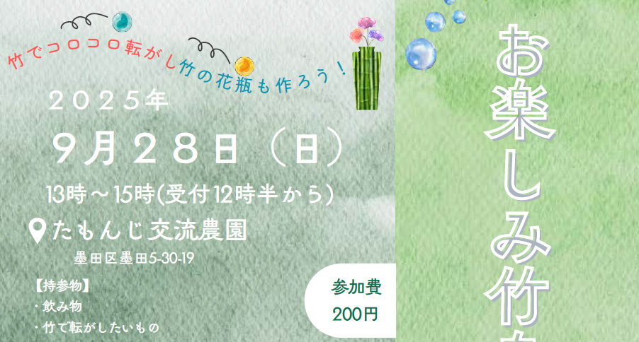 第2回:9月28日 | お楽しみ竹遊び | たもんじ交流農園(墨田区墨田5-30-19)13時~15時(受付開始12時30分) |